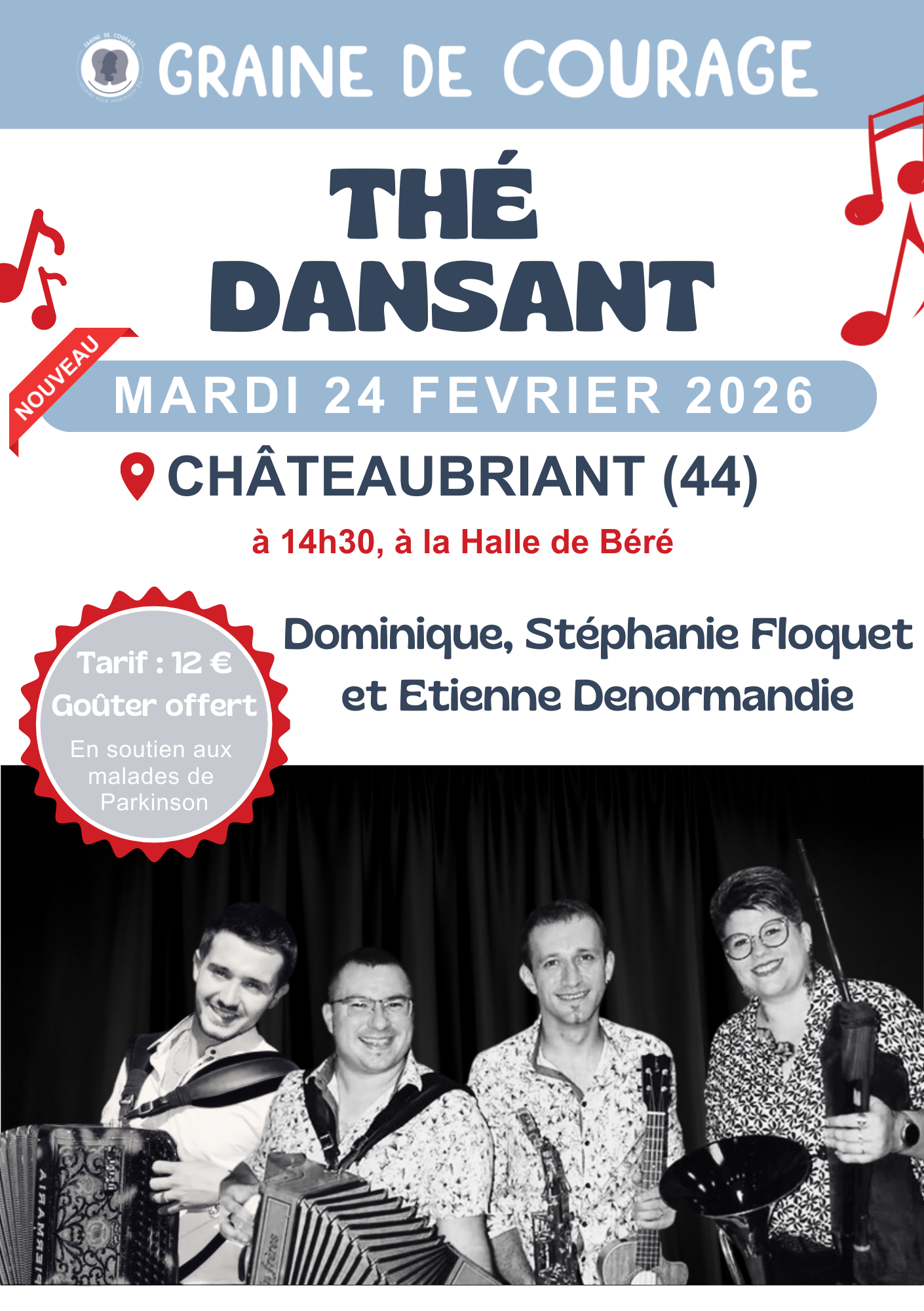 L’association Graine de Courage a le plaisir d’organiser un nouveau Thé Dansant avec la participation de Dominique, Stéphanie Floquet et Etienne Denormandie à Chateaubriant, le 24 février à 14h30. |
